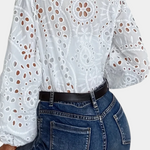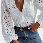 Adopta la elegancia bohemia sin esfuerzo con la Blusa Alba con Ojal. Confeccionada en encaje ligero y detallada con delicados bordados de flores recortadas, esta blusa es una verdadera declaración de encanto libre. El escote en V profundo añade un toque de feminidad, mientras que el corte holgado y los puños elásticos la mantienen cómoda y fresca.