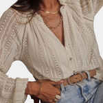 Presentamos la Blusa Hanalei - un esencial bohemio de playa para cada mujer. Esta elegante blusa presenta un diseño de encaje vintage, perfecta para largos días de verano. Los intrincados detalles de calado añaden un toque de estilo y feminidad a cualquier atuendo casual.