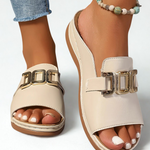 Con un diseño contemporáneo y detalles metálicos llamativos, estas sandalias son ideales para quienes buscan combinar comodidad y elegancia. El cierre decorativo añade un toque sofisticado, mientras que la plantilla acolchada y la suela de goma garantizan bienestar durante todo el día.