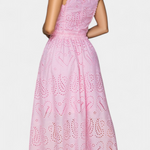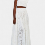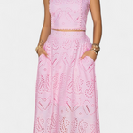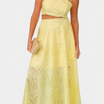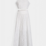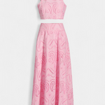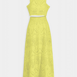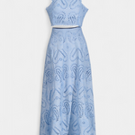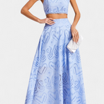 Romántico y ligero, Danitza es un conjunto de dos piezas que fusiona la frescura veraniega con la delicadeza del encaje floral calado. El top corto sin mangas, con cuello alto y acabado festoneado, aporta un aire elegante y sofisticado. Combinado con la falda maxi de cintura alta y vuelo amplio, este look realza cada movimiento con gracia y feminidad.