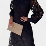 Romántico, elegante y con un aire de cuento, el vestido Lucinda combina encaje calado con una silueta fluida que evoca feminidad etérea. Sus mangas farol translúcidas y el cuello alto estructurado crean una presencia refinada, mientras el forro interior aporta comodidad sin sacrificar estilo. Una pieza ideal para ocasiones que requieren elegancia con encanto.