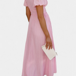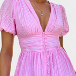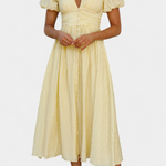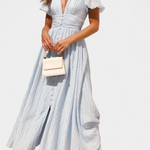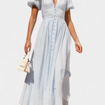 Sutileza romántica con un aire veraniego irresistible. El vestido Mélia combina un escote en V profundo, mangas abullonadas y una falda fluida con abertura en pliegues que se mueve con gracia. El cinturón ajustable en la cintura define la silueta con delicadeza, mientras los botones frontales aportan versatilidad y detalle visual.