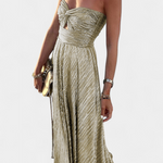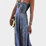Dramático, luminoso y diseñado para robar miradas, el vestido Onelia eleva cualquier ocasión con su tejido plisado iridiscente y su silueta estructurada. El escote en forma de corazón y el detalle de abertura frontal aportan un aire sofisticado y sensual, perfecto para escapadas junto al mar o noches inolvidables.