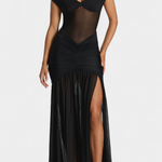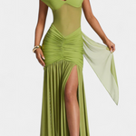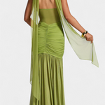 Una silueta que deslumbra con cada movimiento. El vestido Therese combina la elegancia del escote en V con una espalda baja y un diseño fruncido que resalta la figura. La caída fluida y la abertura en el muslo aportan sofisticación y un toque sensual, ideal para eventos que exigen presencia.